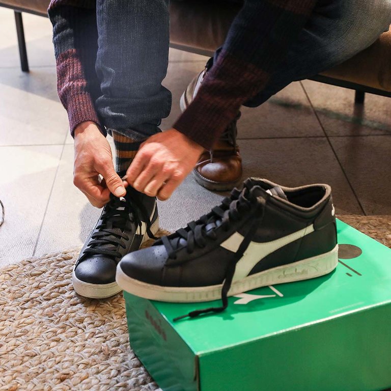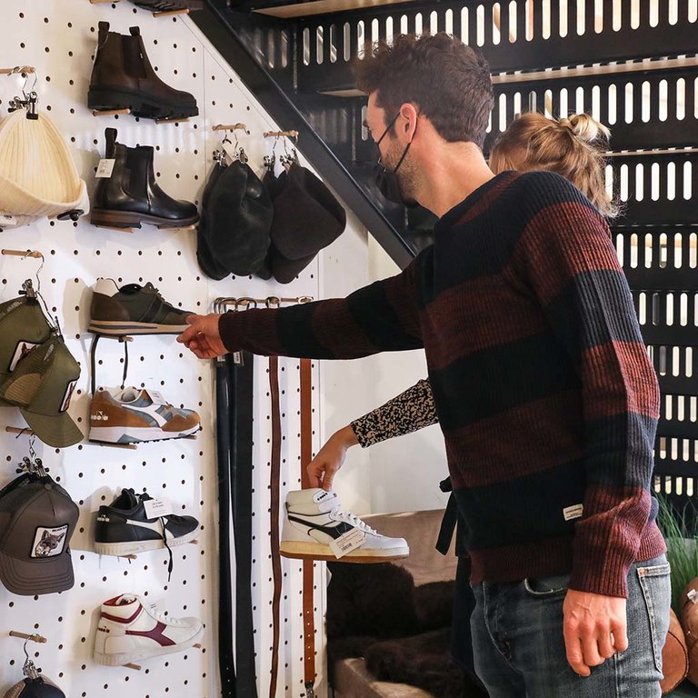 First things first: schoenen passen. Sven haalt er een paar zwarte sneakers uit. Ze bevallen, maar overtuigen niet. Oona stelt een ander model voor: stoere, stevige hikingboots met veters die perfect bij zijn sportieve karakter passen. Het sneakerplan wordt opgeborgen, want de hikingboots gaan sowieso al mee naar huis.