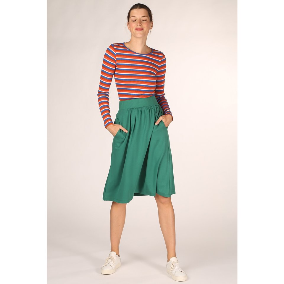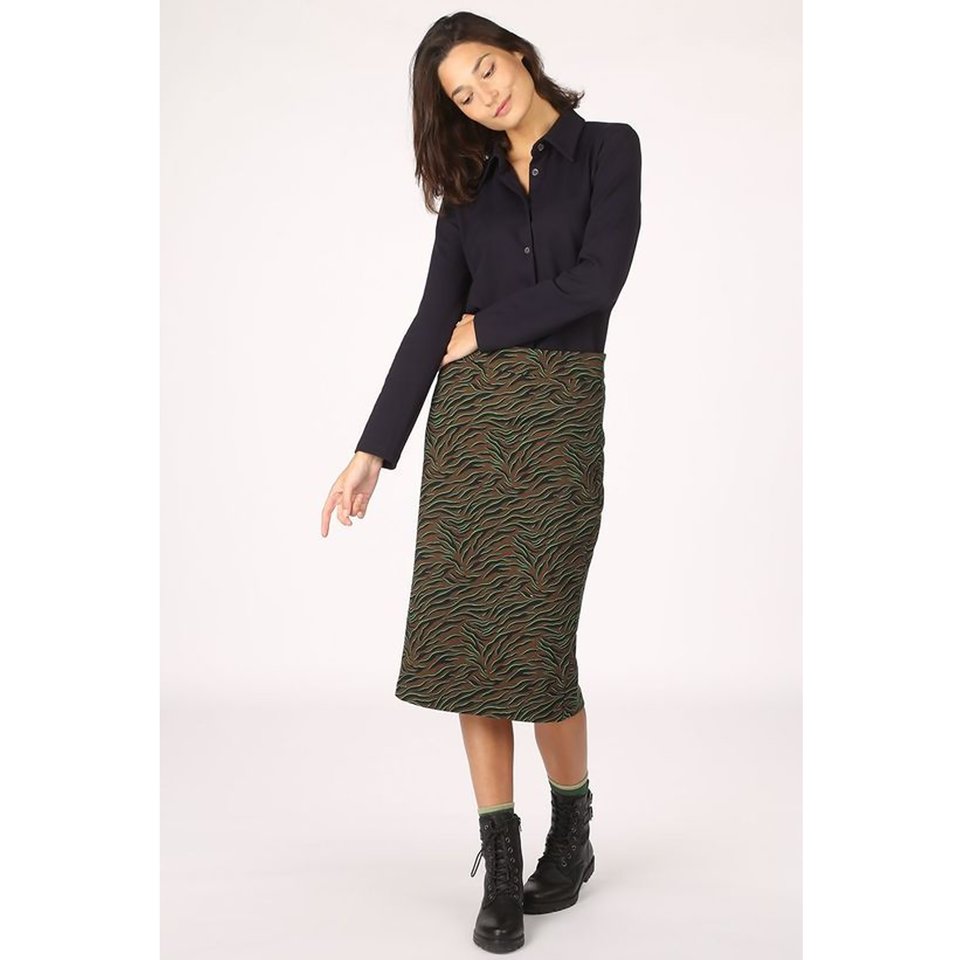 - een licht gerimpelde rok die langs het lichaam valt zonder veel volume toe te voegen