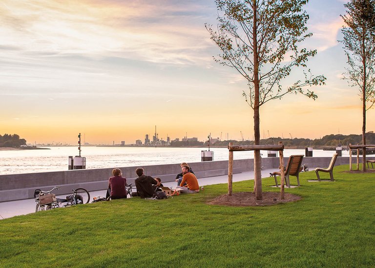 Picknicken in Antwerpen moét wel met zicht op de Schelde. Opties genoeg, maar het Droogdokkenpark op het Eilandje is met z’n houten banken, brede trappen, wandelpromenades, bomen en gras terecht een hotspot.
