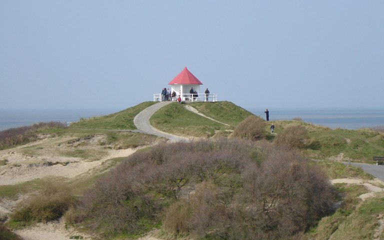 Eerst een ferme strandwandeling, daarna trek je de duinen in. Tussen de ups en de downs van de zandbergen duikt hier plots de Spioenkop op, een schattig rond paviljoentje met een knalrood dak.
